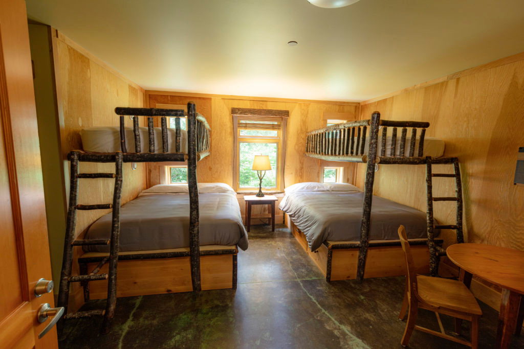 IslandWood offers four cabin-style lodges on campus, each with private bedrooms and spacious communal living areas for gathering and relaxing. Rooms accommodate 2–6 guests and include a bathroom with a separate shower, toilet room, and sink area.